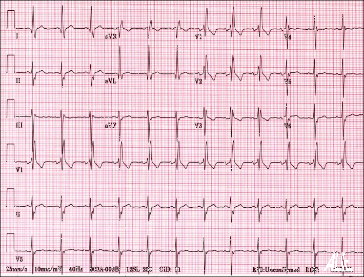| Fc à 76, PR à 154 ms., QRS de 140 ms., QT de 396 ms., avec QTc de 445 ms., axes P R T respectivement de 42 -45 22°, rythme sinusal avec bloc de branche droit et hémibloc antérieur gauche, (Bloc bifasciculaire). | |